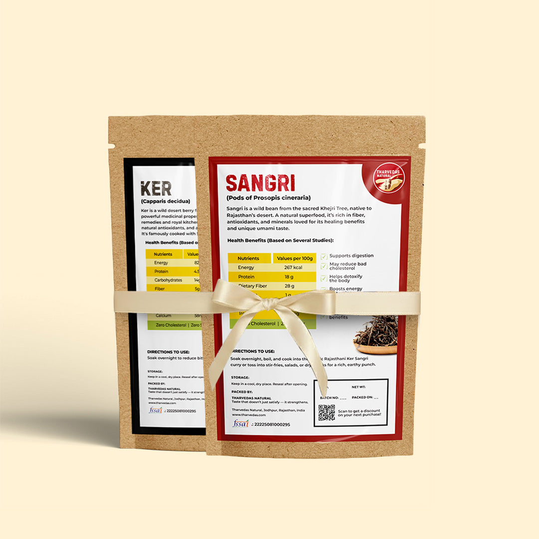Ker and Sangri is a traditional Rajasthani delicacy combining tender Ker berries and dried Sangri beans. This unique blend offers a distinctive tangy and spicy flavor, making it an exceptional accompaniment for various Indian meals. Rich in fiber and antioxidants, Ker + Sangri supports digestion and promotes overall health. Perfect for adding authentic regional taste and nutritional value to your culinary repertoire.